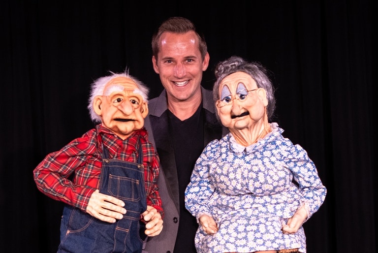 It’s a laugh a minute when you follow your favorite funnyman and his friends through a lifetime devoted to lighthearted comedy and uplifting entertainment. Hear from his friends Harold and Irene, the opinionated grandparents, and Jeffrey, the 8-year-old wisecracker and his older (but smaller) brother. And look for cameo appearances by characters from throughout his 30 years as a ventriloquist.